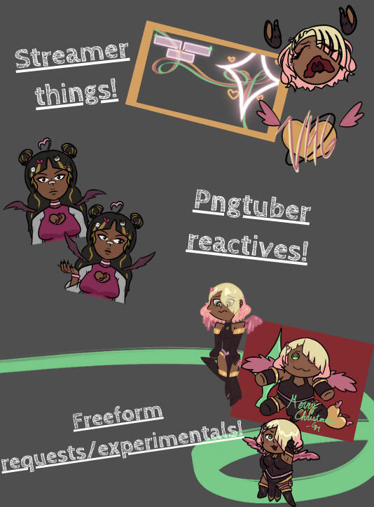 I also offer the chance for different commission types. I'm always learning how to do more. You can find pricings on my Ko-Fi, or message me for estimates. I also take Paypal directly (prices in usd)